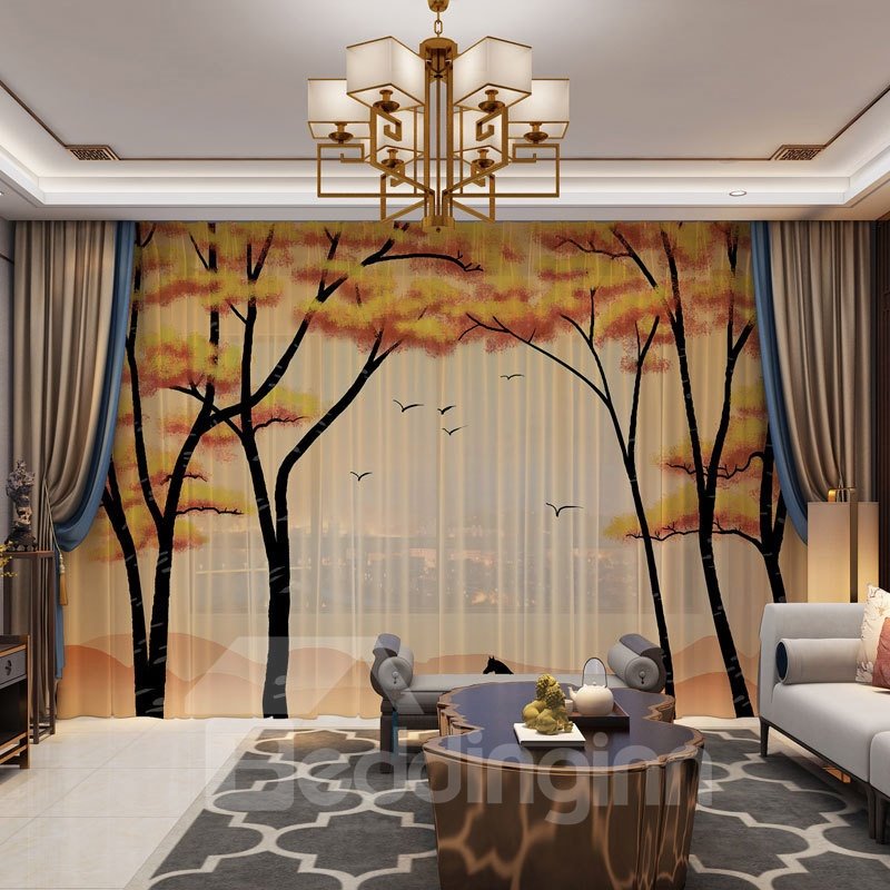 3D Autumn Dusk and Flying Birds Printed 2 Panels Custom Sheer