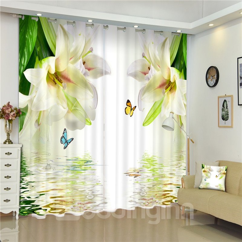 3D Beige Lily Blossoms and Beautiful Butterflies Printed Thick Polyester 2 Pieces Bedroom Curtain