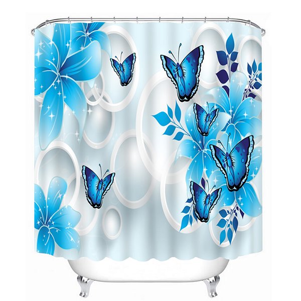 3D Butterflies and Flowers Printed Polyester Sky Blue Bathroom Shower Curtain