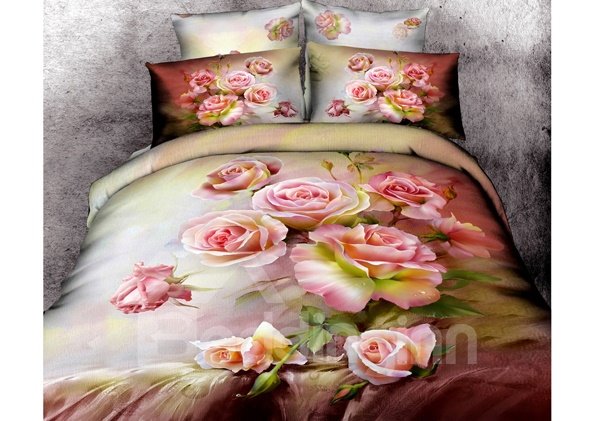 3D Cluster of Pink Roses Printed Cotton 4-Piece Bedding Sets/Duvet Covers