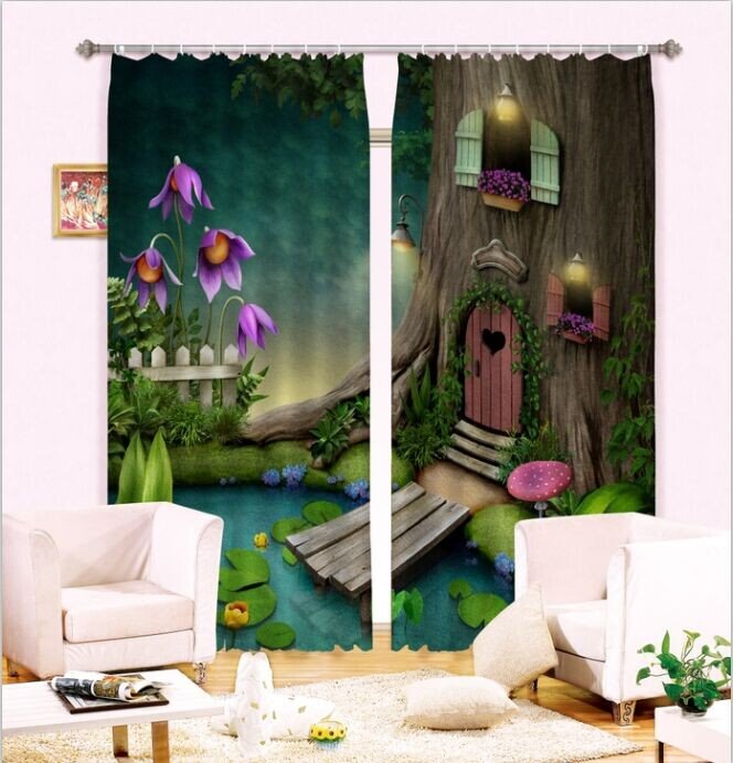 3D Cozy Tree House and Pond Printed Thick Polyester Fantastic Scenery Custom Room Curtain