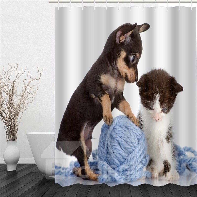 3D Dog Kitten Playing Yarn Ball Printed Polyester Waterproof Antibacterial Eco-friendly Shower Curtain