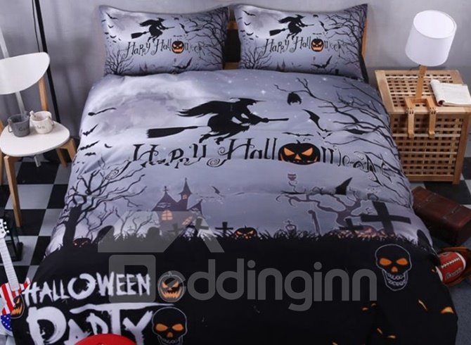 3D Halloween Witch and Skull Printed Polyester 4-Piece Bedding Sets/Duvet Covers