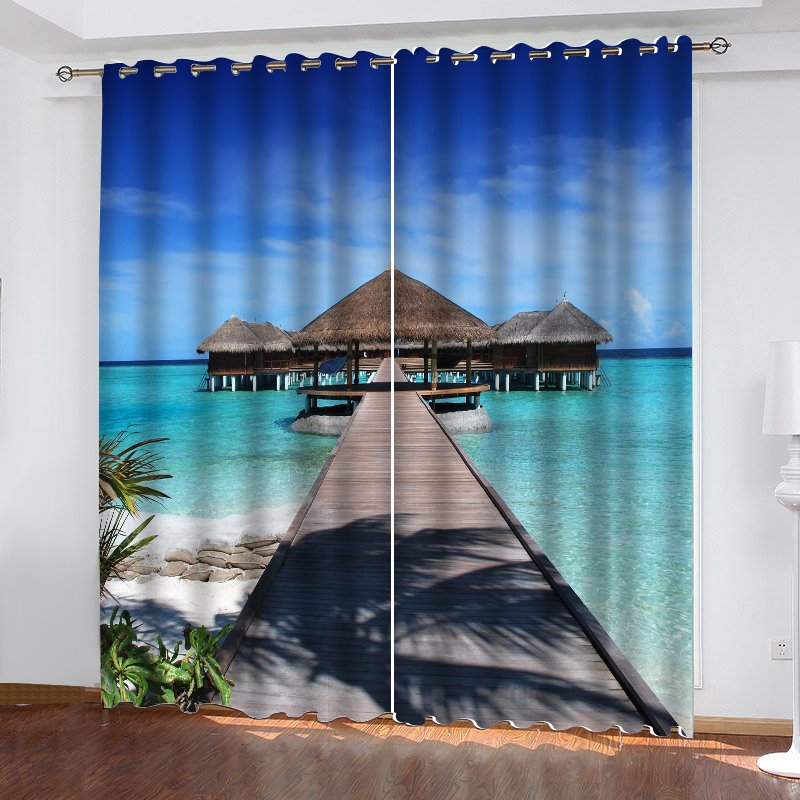 3D HD Digital Print Scenery Blackout Living Room Curtains with Maldives Beach Pattern
