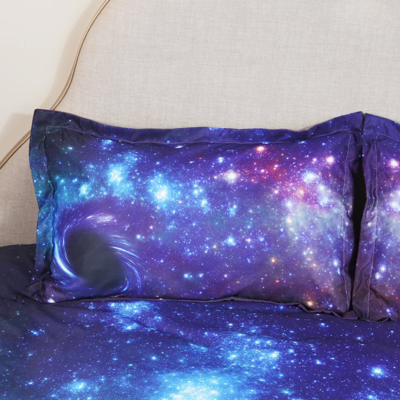 Time to decorate your new bedroom with this galaxy 4-piece duvet cover set. It features a big black hole amongst the countless stars, bringing into your space with the stunning beauty of gigantic galaxy. Made of microfiber polyester, the galaxy bedding set is fade resistant, soft and durable. Reactive printing treatment makes the color vivid and realistic. This black hole galaxy bedding set is an ideal choice to decorate a space themed bedroom. Get it and start your space adventure now.