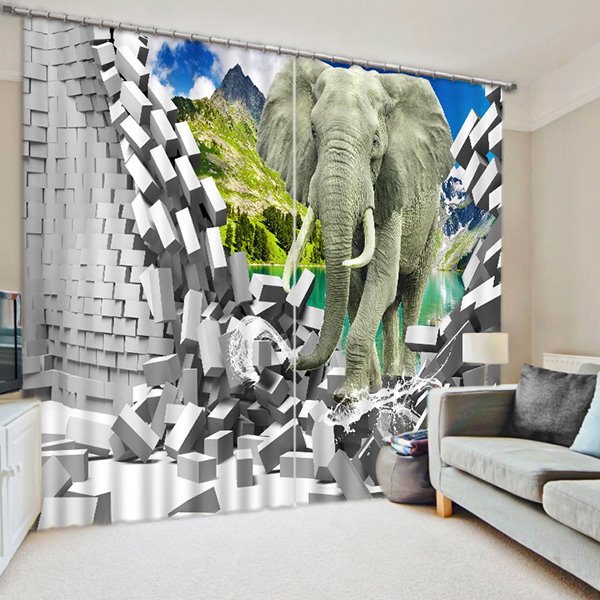 3D Running Elephant Printed Thick Polyester 2 Panels Decorative and Blackout Curtain