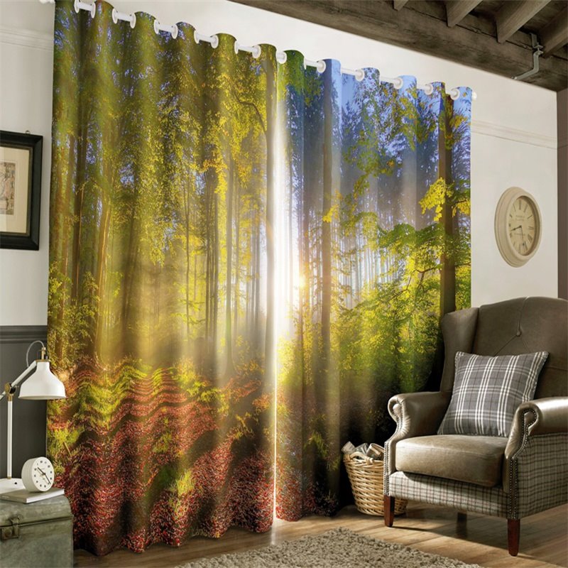 3D Soft Sunlight and Green Trees Printed Morning Scenery 2 Panels Decorative and Blackout Curtain