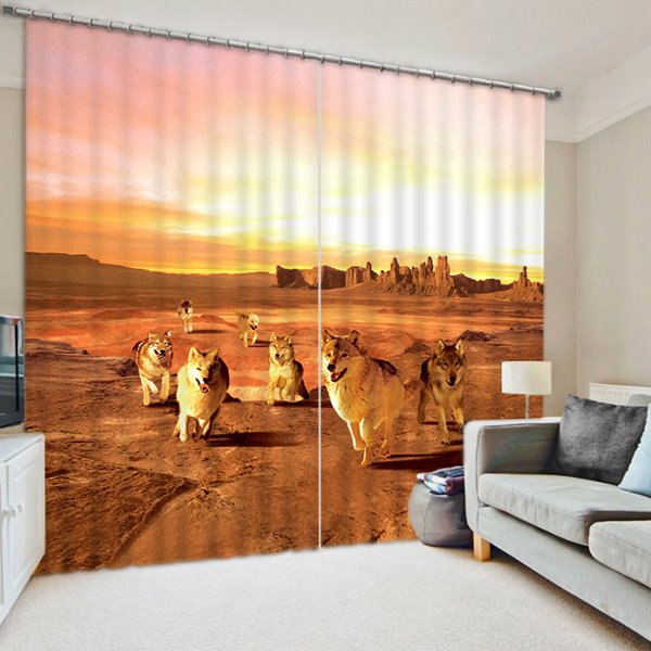 3D Wolves in the Desert with Sunset Printed Thick Polyester 2 Panels Blackout Curtain
