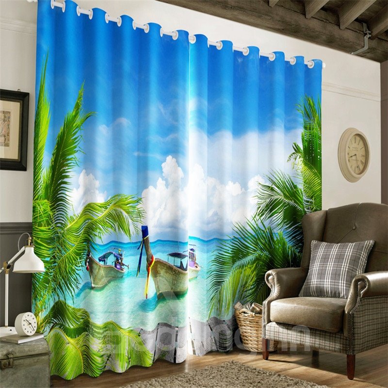 3D Wooden Boats and Blue Sky with Clean Water Printed 2 Panels Grommet Top Curtain