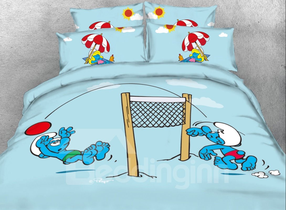 Beach Volleyball Smurfs Printed 4-Piece Blue Bedding Sets/Duvet Covers