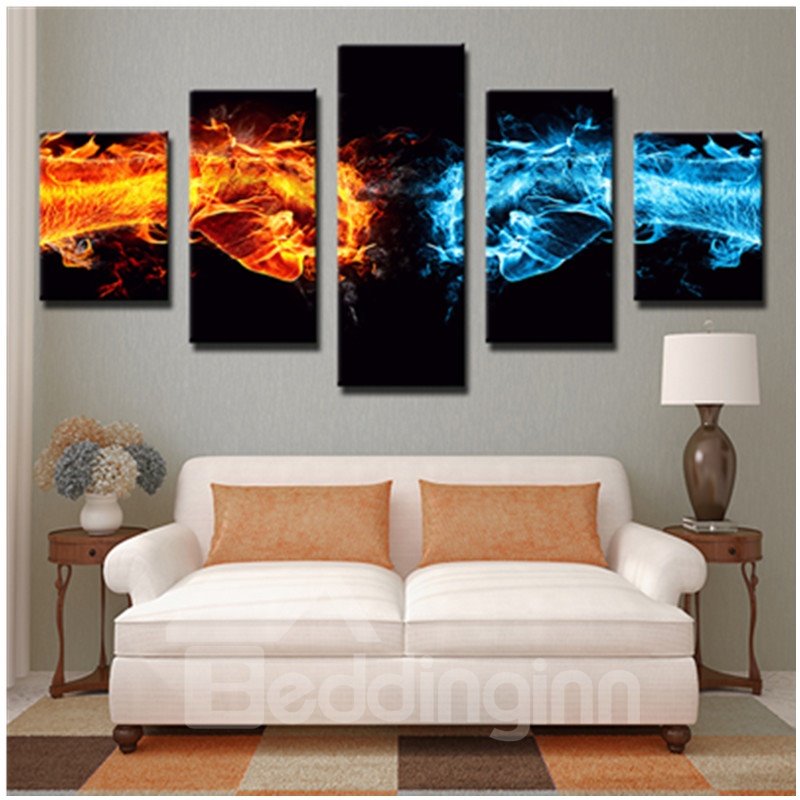 Blue and Yellow Fists with Fire Hanging 5-Piece Canvas Eco-friendly Waterproof Non-framed Prints