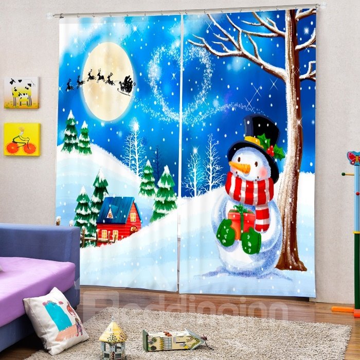 Cartoon Snowman under the Tree in Snowy Weather Christmas Theme Custom 3D Curtain