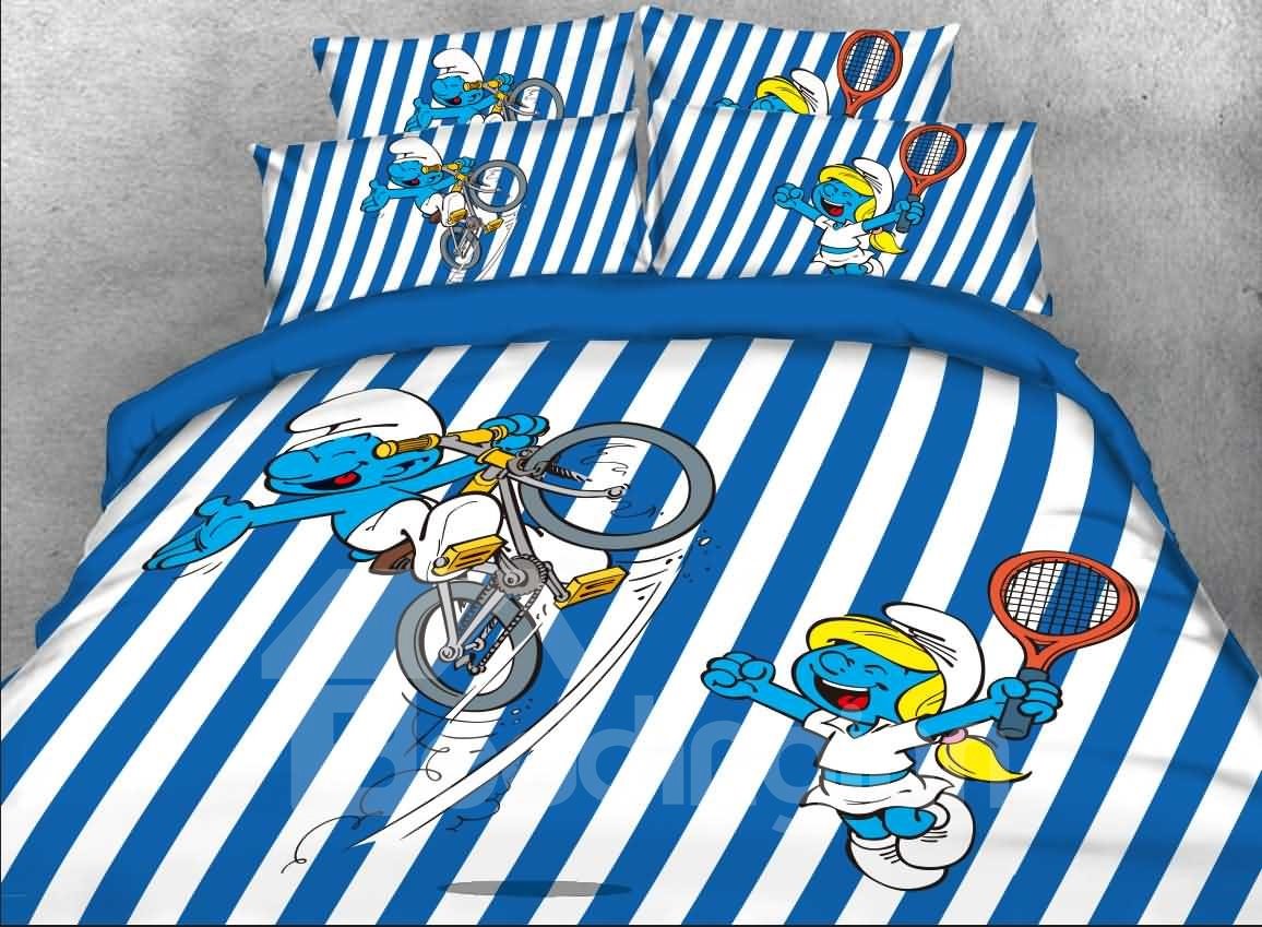 Patterned Cyclist Smurf and Tennis Smurfette, the classic bedding set is a perfect addition to your bedroom. This happy bedding set will go well with your bedroom decor. It features Cyclist Smurf and Tennis Smurfette against white and blue stripes background. With this much quality and detail you will get years of fun. Made of cotton and tencel blend, you’ll experience all the breathable benefits of two materials renowned for adding softness and comfort. Features a hassle-free hidden zipper closure, make it easy and efficient to put this duvet cover on your comforter.