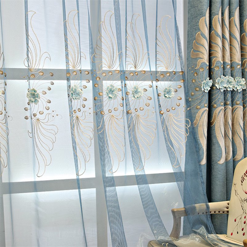 Embroidery Floral European Sheer Curtains Blue Coffee Window Sheer for Living Room Bedroom Decoration Custom 2 Panels Breathable Hook Voile Drapes