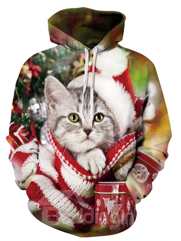 Long Sleeve Christmas Cute Cat Pattern 3D Painted Hoodie