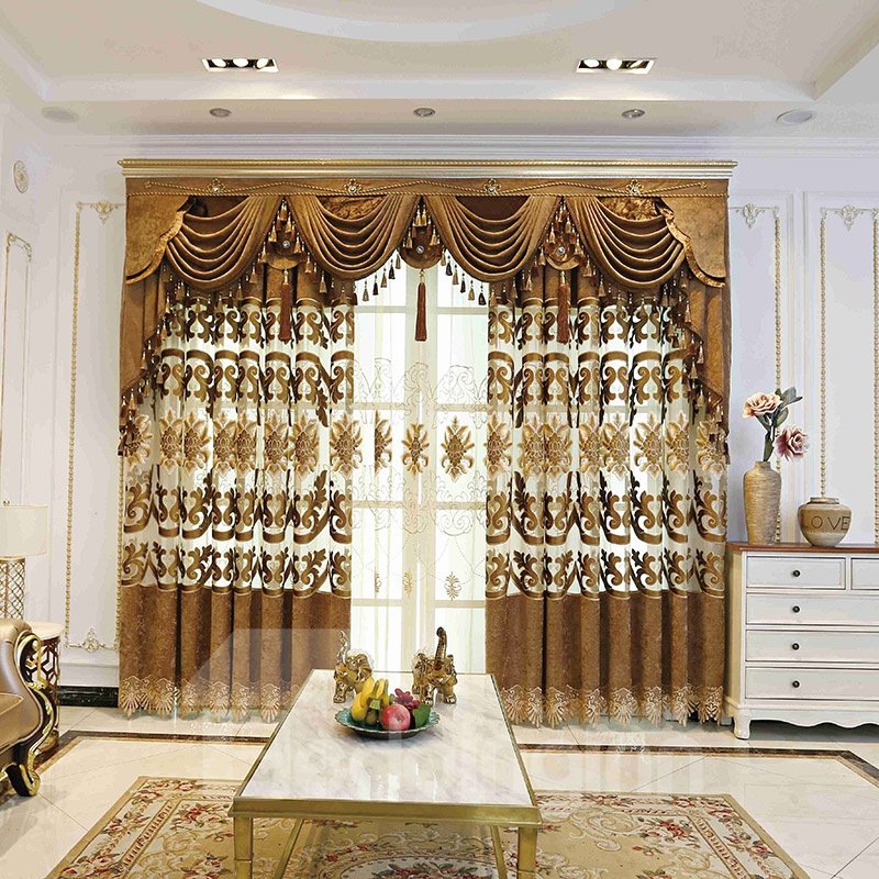 Luxurious Elegant Golden Embroidered Hollowed-out Black Out Ochre Curtains 2 Panel Set 84 Inches Wide and 84 Inches Moderate Shading Effect Ever Fading Cracking Peeling or Flaking