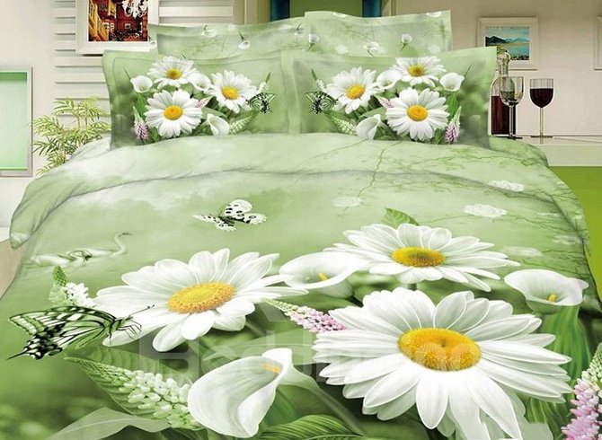 Pastoral Butterflies and Flowers Print Green 4-Piece Cotton Duvet Cover Sets
