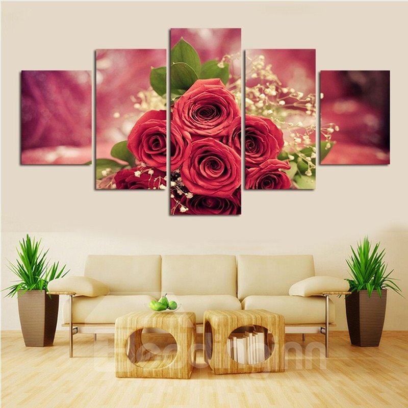 Romance is expressed by roses. It is a perfect gift for girlfriends and boyfriend. Hang it at home, and romantic atmosphere will spread at your rooms. Canvas is non-glare, moisture resistant and UV protected, which is easy to clean. Simply wipe down with a damp cloth as needed. Five prints should be hung on the wall horizontally. It is better that these prints should be integrated into frameworks prepared.