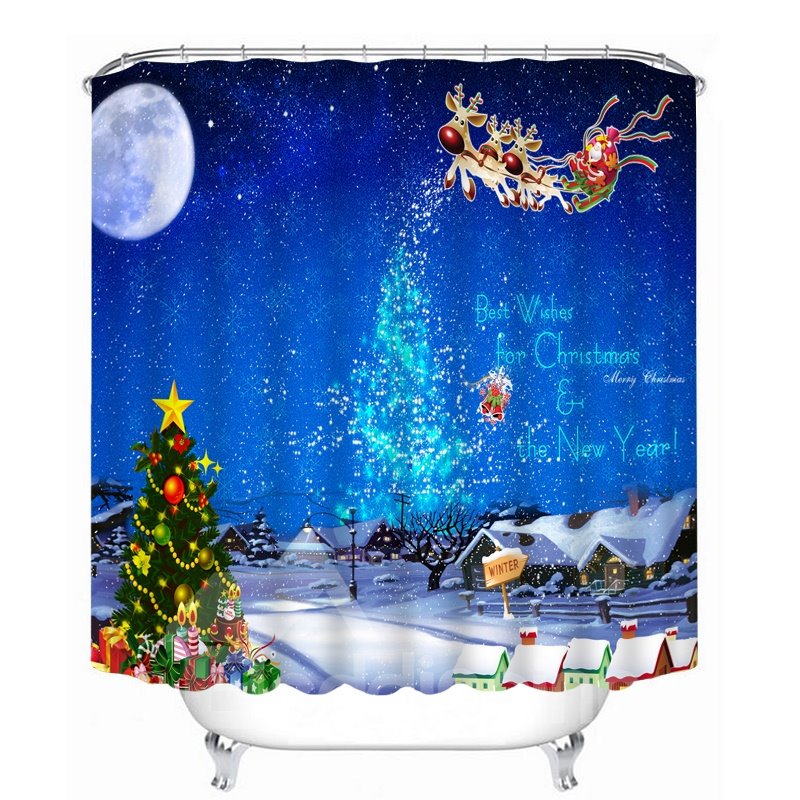 Santa Riding Reindeer in the Sky Printing Christmas Theme Bathroom 3D Shower Curtain