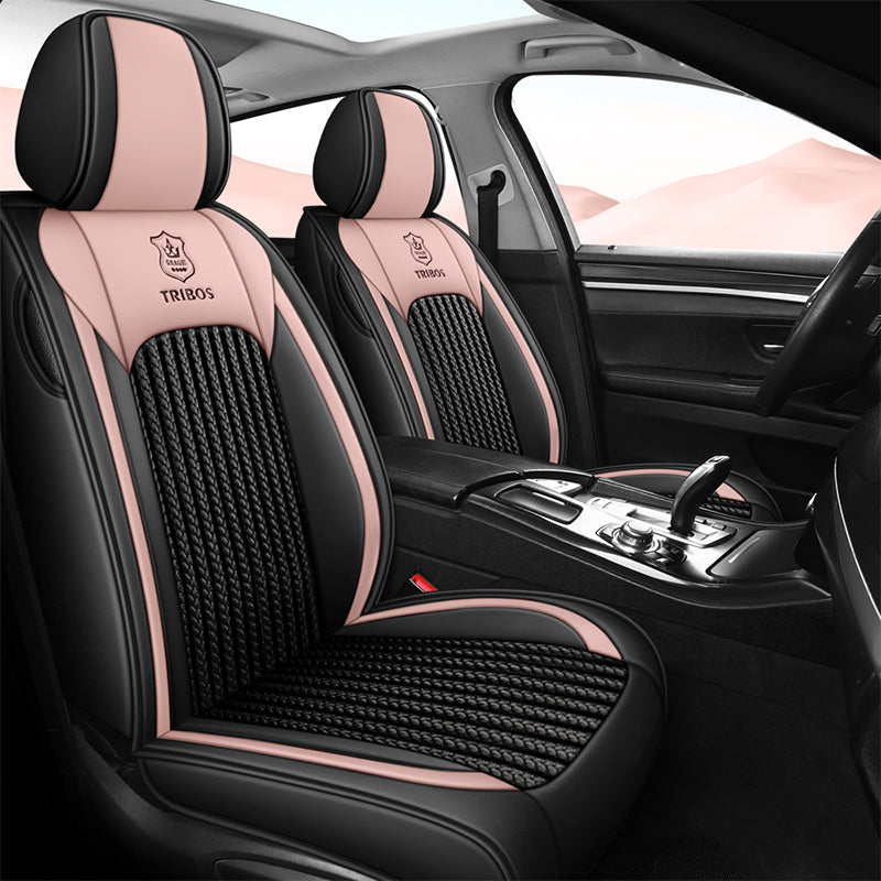 Time to make your car look and feel fresh with our leatherette and fabric car seat covers! This full set of car seat covers combine faux leather and cooling fabric together, so it is durable, cool and comfy. The seat cover part your body engages with are basically made of knitted cooling fabric, so they won’t heat up that much like common leatherette covers. And they kind of give you massaging feeling and release of pressure point feeling from sitting too long when driving. The perfect mix of leatherette and fabric add some modern yet classcial elements to your interior. Order your set of weave knitted pattern car seat covers today. Keep your car seats looking and feeling fresh!